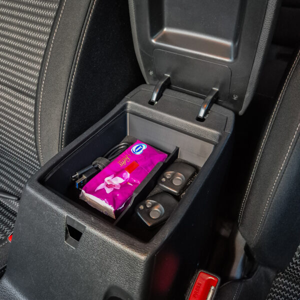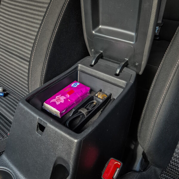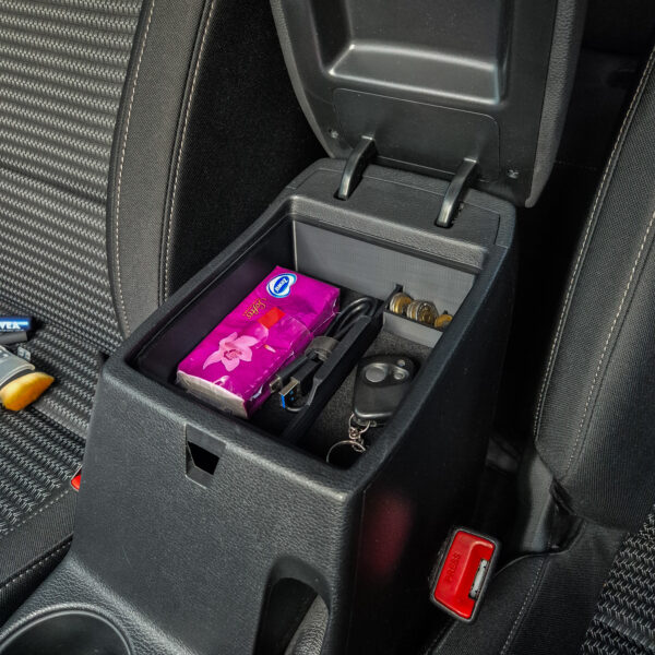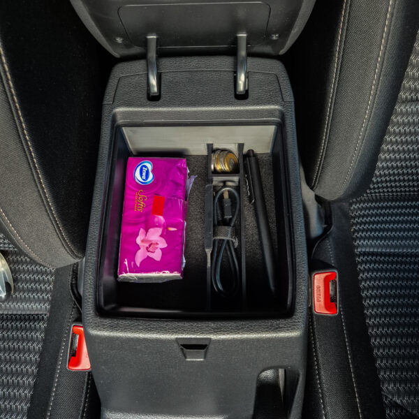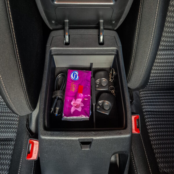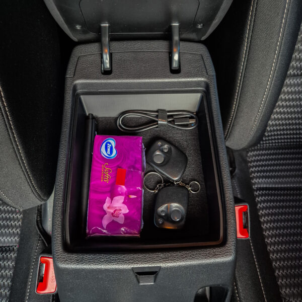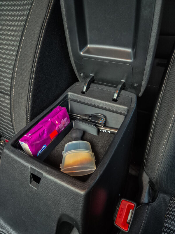 Organizer został zaprojektowany aby idealnie wypełnić przestrzeń podłokietnika, a jednocześnie można go było łatwo podnosić i wyciągać.